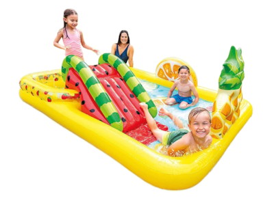 Pishinë me fryrje Intex Qendra e lojërave me fruta: Shesh lojërash me ujë për fëmijë me rrëshqitje dhe dush në temën e përrallës Winnie the Pooh. Ai përfshin gjithashtu 6 balona. I përshtatshëm për fëmijë nga 3 vjeç. Qendër lojërash me fryrje Intex me një rrëshqitje me motiv frutash – argëtim i mrekullueshëm