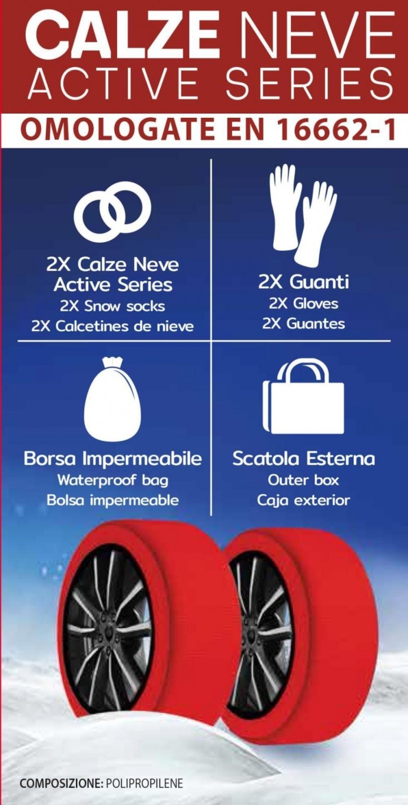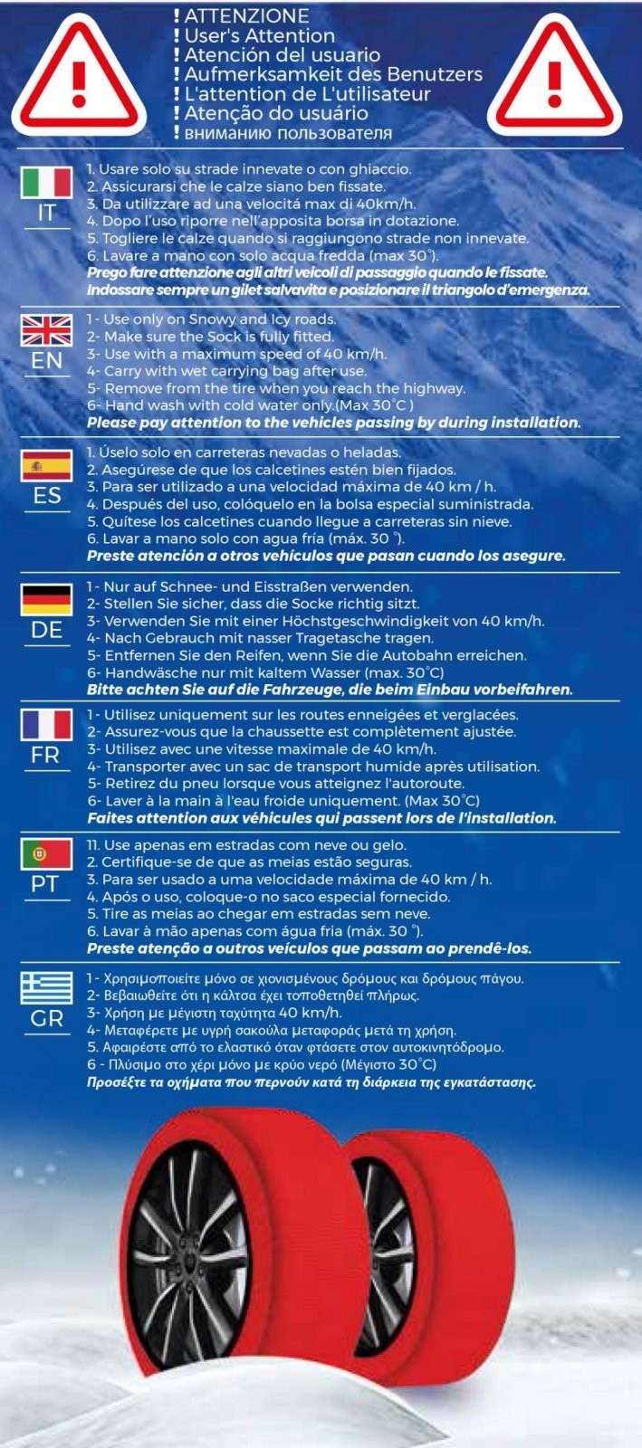E përputhshme me gomat 165/80 R13,175/80 R13,185/80 R13,195/70 R13,205/65 R13,205/70 R13,225/60 R13,235/60 R13,155/80 R13,155/80 R13,195/70, R14,175/70 R14 E përputhshme me gomat 175/75 R14,175/80 R14,185/65 R14,185/70 R14,185/75 R14,195/65 R14,195/70 R14,215/70 R14,215/205/605 R14,215/65 R14,225/55 R14,225/60 R14 E përputhshme me gomat 135/80 R15,145/80 R15,155/70 R15,155/80 R15,165/65 R15,165,175/175 R15,185/60 R15,185/65 R15,195/55 R15,195/60 R15,195/65 R15,200/60 R15, E pajtueshme me gomat 205/55 R15,205/60 R15,215/215/201 R15,225/55 R15,235/45 R15,245/50 R15,255/45 R15,165/65 R16,175/55 R16,175/60 R16,185/55 R16,185/60 R15,185/60 R16,175/55 R16,175/60 R16,185/55 R16,185/60 R16,185/60 R150195 R16,205/50 R16,205/55 R16,215/45 R16,215/50 R16,225/45 R16,225/50 R16,245/45 R16,175/55 R17,195/45 R17,195/45 R14,225/50 R17,215/40 R17,215/45 R17,225/40 R17, E përputhshme me gomat 225/45 R17,235/40 R17,245/35 R17,245/40 R17,255/40 R17,2415/205/35 R18,215/40 R18,225/30 R18,225/35 R18,235/35 R18,245/35 R18,255/30 R18,255/35 R18,245/30 R19 Kompleti përfshin 2 çorape bore me shpejtësi 2 hm (më shumë se 2 çorape 4 hm N), çorape të montuara,Për t’u përdorur vetëm në rrugë të mbuluara me borë ose me akull, mos përdorni zinxhirë në asfalt, Miratuar me Direktivat EN 16662-1-2020, Montim dhe çmontim i lehtë në 2 minuta, Pas përdorimit, ju rekomandojmë t’i lani çorapët me ujë të ngrohtë dhe t’i lini të thahen përpara se t’i ruani në çantën e ofruar. Strukturë me rezistencë të lartë. Teknologjia tredimensionale e pëlhurës lejon tërheqje dhe kapje të shkëlqyer. Testuar deri në 120 km në rrugë të mbuluara me borë. Gjithashtu i përshtatshëm për automjete me hapësirë të kufizuar midis kolonës së drejtimit dhe gomës dhe për këtë arsye nuk është i përshtatshëm për zinxhirë dëbore. 6 madhësi të disponueshme: XS (SKU: CN1688-XS), S (SKU: CN1688-S), M (SKU: CN1688-M), L (SKU: CN1688-L), XL (SKU: CN1688-XL), XXL (SKU: CN1688-S, përputhshmëria me 8/0XL) R13, 175/80 R13, 185/80 R13, 195/70 R13, 205/65 R13, 205/70 R13, 225/60 R13, 235/60 R13155/80 R14,165/65/75 R14,175/75 R14,175/80 R14,185/65 R14,185/70 R14,185/75 R14,195/65 R14,195/70 R14,205/60 R14,205/65 R14,205/65 R14,195/65 R14,225/55 R14,225/60 R14135/80 R15,145/80 R15,155/70 R15,155/80 R15,165/65 R15,165/70 R15,175/65 R15,155/80 R15,185/65 R15,195/55 R15,195/60 R15,195/65 R15,200/60 R15,205/55 R15,205/60 R15,215/50 R15,215/55 R15,215/55 R15,205/55 R15,235/45 R15,245/50 R15,255/45 R15165/65 R16,175/55 R16,175/60 R16,185/55 R16,185/60 R16,195/50 R15,196/ R16,205/55 R16,215/45 R16,215/50 R16,225/45 R16,225/50 R16,245/45 R16175/55 R17,195/45 R17,205/40 R15,2105/ R17,215/45 R17,225/40 R17,225/45 R17,235/40 R17,245/35 R17,245/40 R17,255/40 R17,275/35 R17205/40 R15,218/ R18,225/30 R18,225/35 R18,235/35 R18,245/35 R18,255/30 R18,255/35 R18245/30 R19.